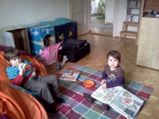 Tegnap este megérkezett Nana… mindannyian elautóztunk érte Genfbe. Máté azonnal elaludt, amint elindultunk… nem is csoda: délelőtt ovi, majd itthoni fergeteg, végül rendrakás… mire útra keltünk, mindketten kipurcantak. Kinga így is énekelt egész úton, és csak visszafelé nyűgösködött… azért egy mekis vacsi őt is lecsendesítette. Té viszont felfordult gyomorral, enyhén zöld bőrrel ült hátul… Amikor aztán az autópályáról letértünk, és elkavarodtunk már Vevey-ben, a hegyen, kipakolt… Csak itthon ette meg az úti elemózsiát.
