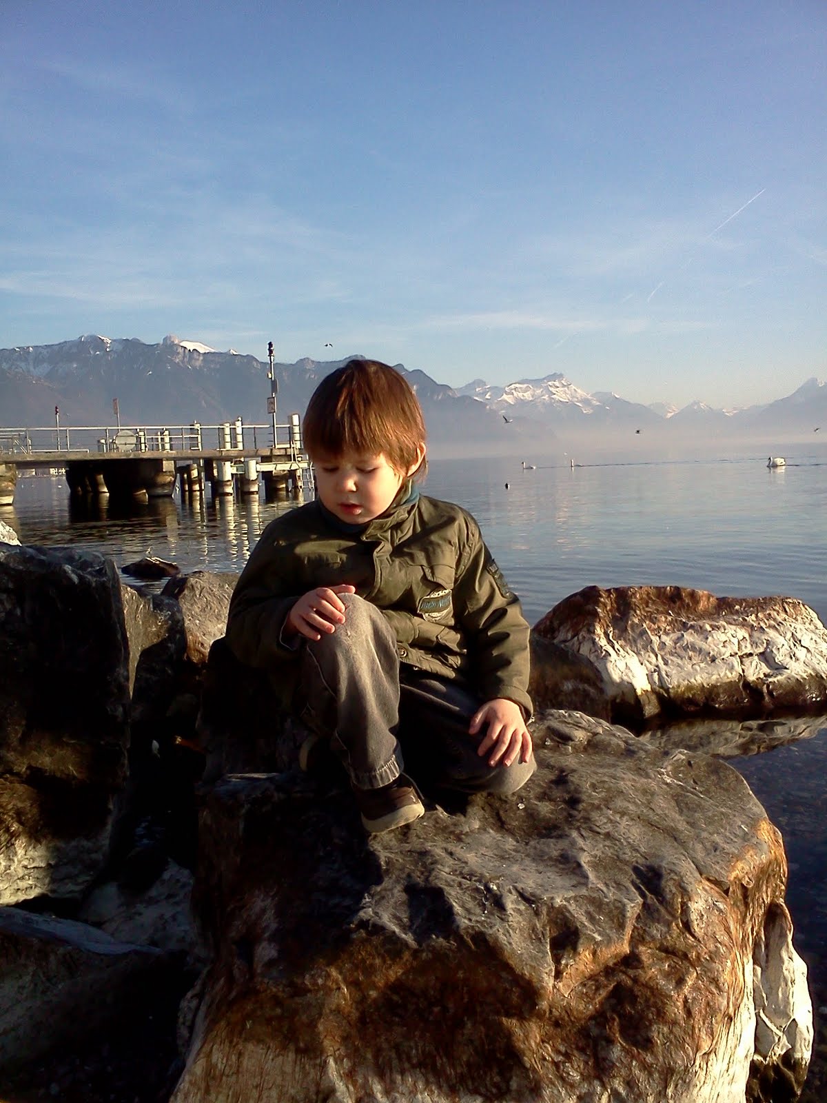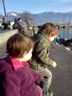 Ezt is hamarosan meguntuk, úgyhogy elindultunk igazi célunk felé: megtekinteni a gyermekkönyvtárat. Egy szórólap már tájékoztatott arról, hogy ingyenesen 7 könyv, és 2 cd 4 hétre kölcsönözhető ki, de gondoltam hátha vannak más programjaik is. És lőn… kiderült, hogy minden hónap első szombatjának reggelén mesét olvasnak minimanóknak (0-3 évesig)… a következő március 5-én lesz… szerintem elmegyünk, még ha nem is értjük… hátha mégis lesz haszna. Gyerekeknek ingyenes a beiratkozás is, felnőtteknek egyszeri 10 CHF… a felnőtt részleg egész jó könyvtárnak tűnik, sok angol nyelvű könyv is található. A könyvtárosnénik fiatalok, és nincs jellegzetes könyvtárosnéni-szaguk 😀 A gyerek részlegen a “néni” (kb. 25 éves) beszél angolul, van külön sokpárnás olvasósarok, rengeteg jónak tűnő gyerekkönyv. Van szülők klubja, ahol tematikus konferenciákon lehet a gyermeknevelés nehézségeit megtárgyalni franciául (hm… ez nem tudom nekem mennyire hasznos egyenlőre), valamint minden hónapban egy meghatározott napon össze lehet gyűlni csak úgy beszélgetni hasonszőrű gyerekeket nevelgető, hasonszőrű felnőttekkel… szintén franciául… de hát ki tudja. És van baba-mama torna is, bár az Montreaux-ben, és csak 2 évesnél idősebb gyerekkel lehet menni… áprilistól ez is bejöhet.