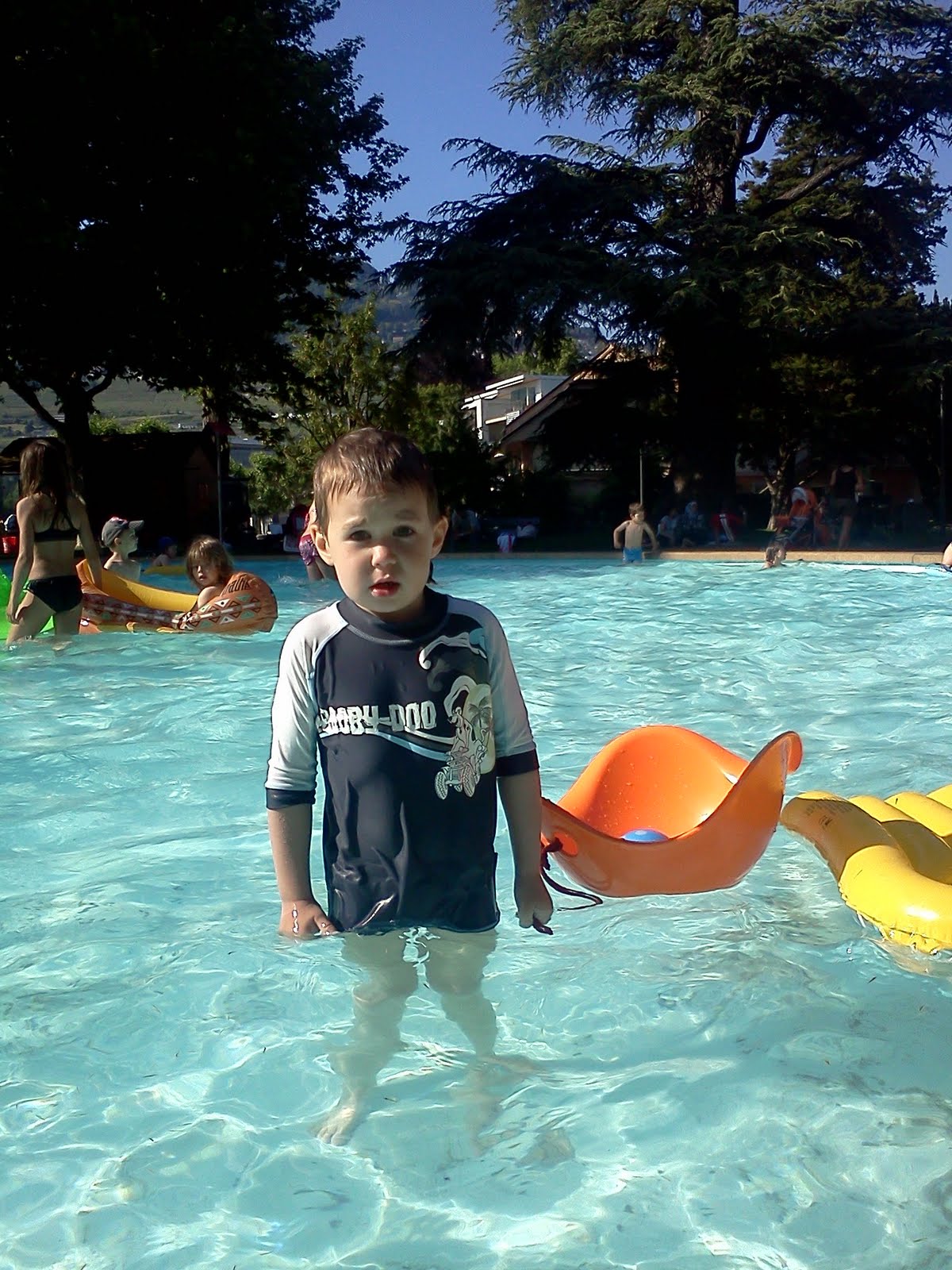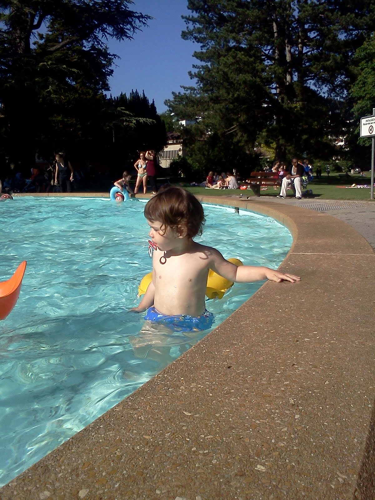 Tegnap voltunk késő délután a tóparton, a kalózhajós játszótérnél. Van ott egy hejre kis gyerekmedence, ami ezúttal tömve volt ugráló, nevetgélő, pancsoló, fröcskölő gyerkőcökkel, egész aprótól a tizenévesig. Máté fülig érő szájjal rohangált benne, maga után húzva a narancssárga Bilibót, amit Kingus kapott szülinapjára (feljegyzendő: Máté is szeretne egyet… zöldet!). Kicsi lánykám nem volt ennyire bátor, de ő is hősiesen kitartott… egyik kezében a kis felfújható matrac zsinórját szorongatta, a másikkal a medence szélébe kapaszkodott, így bandukolt körbe-körbe… néhol összerezzent, amikor egy nagyobbacska gyerek pont mellette csobbant a vízbe, vagy amikor véletlenül egymást fröcskölő hancúrkák közé keveredett. Egyszer kellett csak kimentenem, amikor elsőszülöttem épp mellette ugrott vízbe, óvatlanul magával rántva hugicáját… na ez nem teszett neki… Na én ekkor lettem csurom vizes… ruhástul 😀