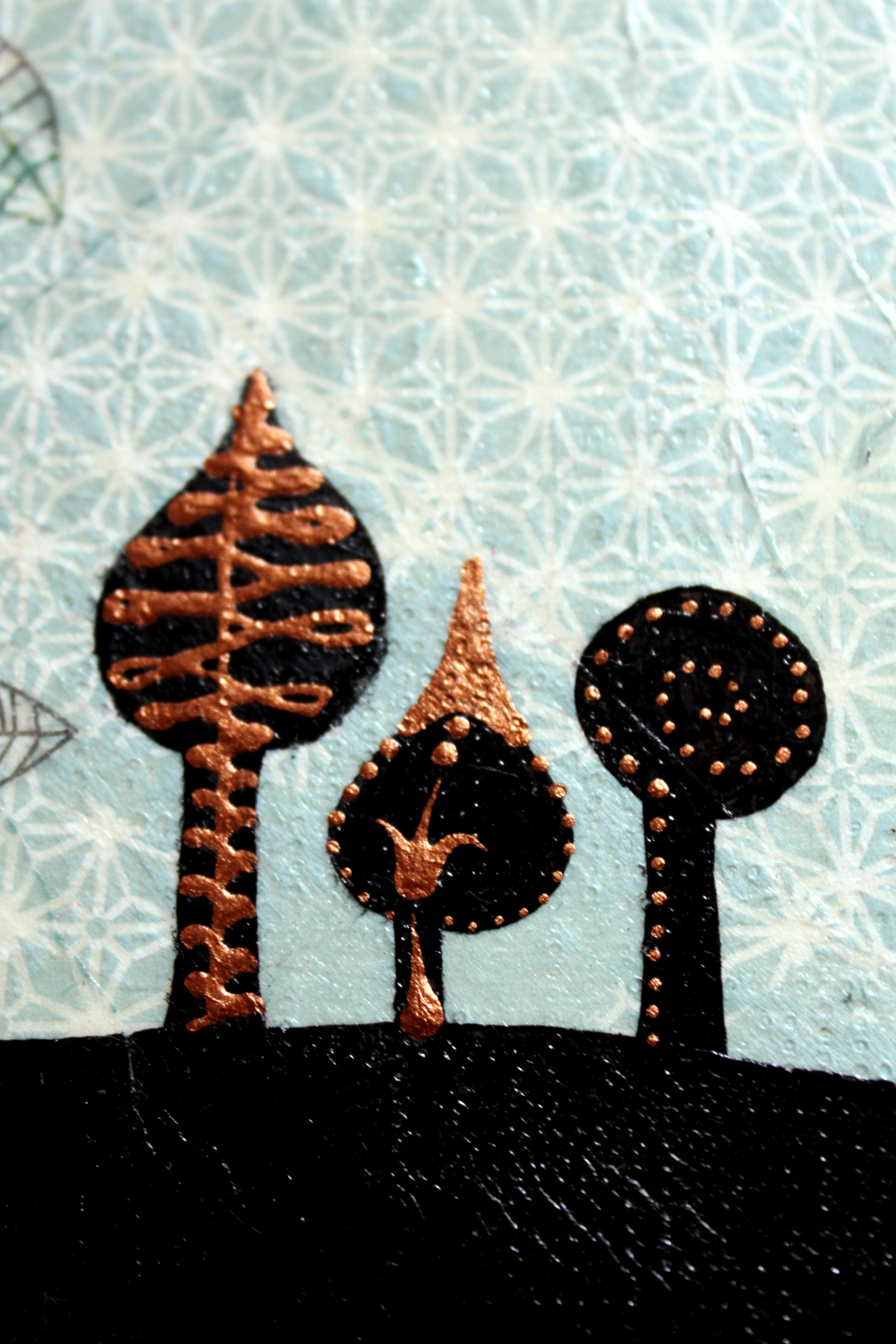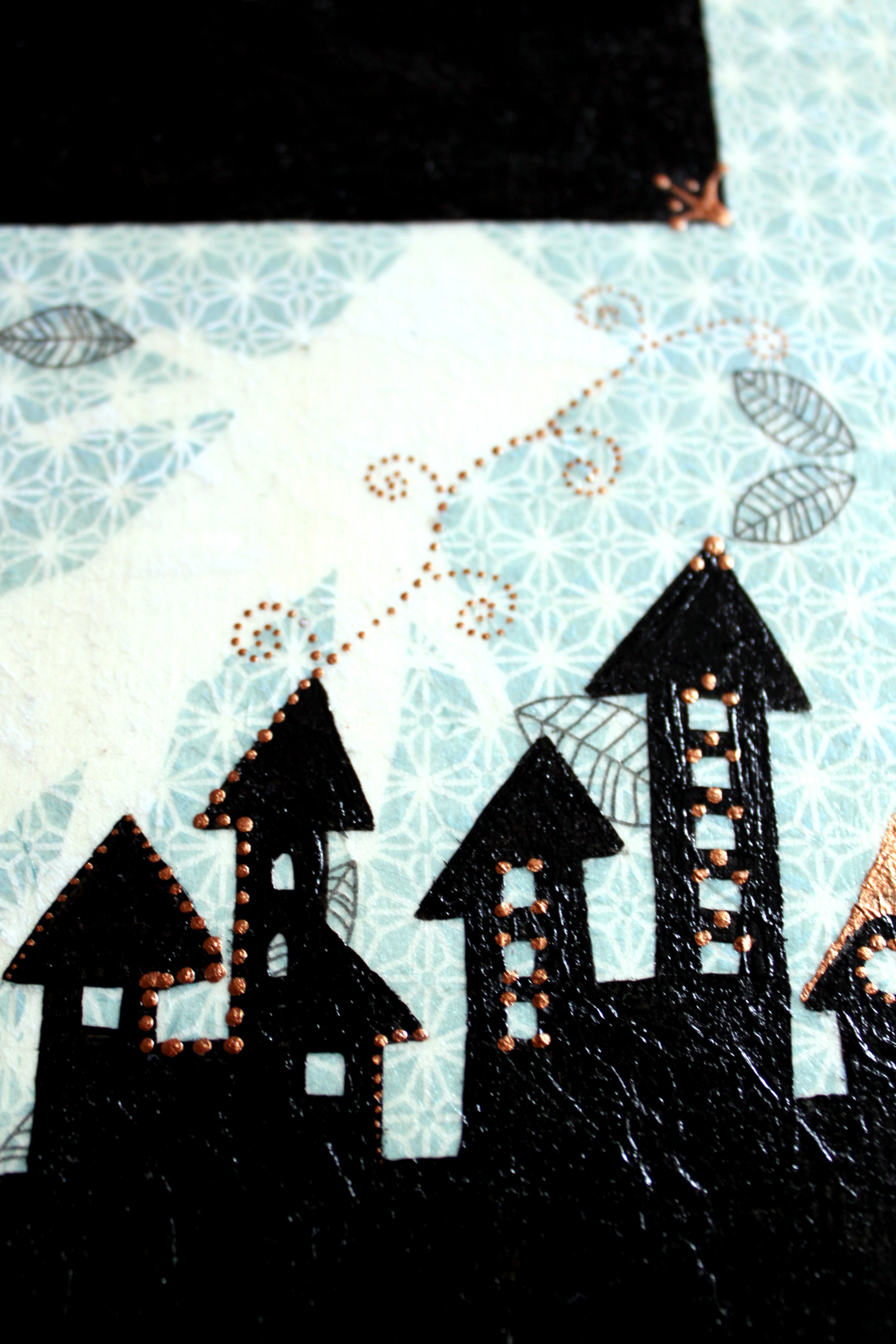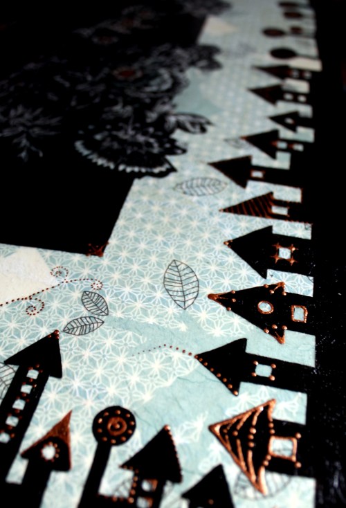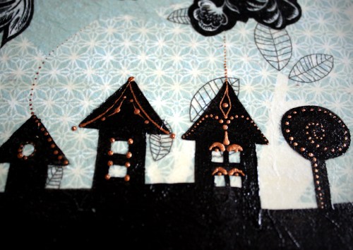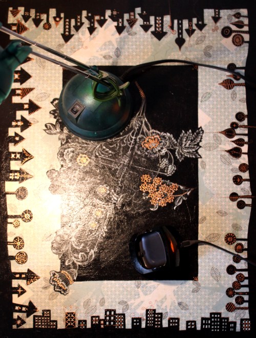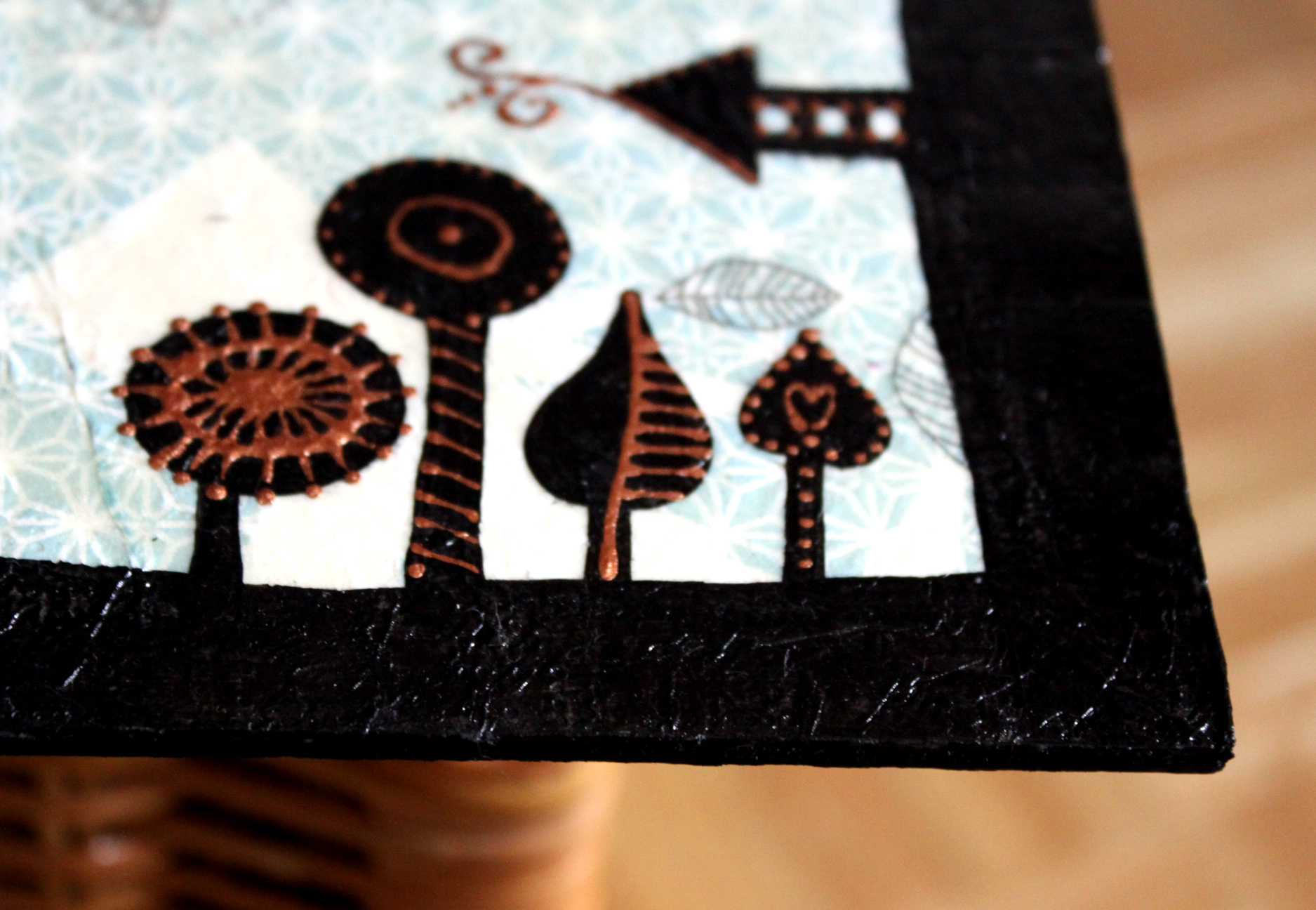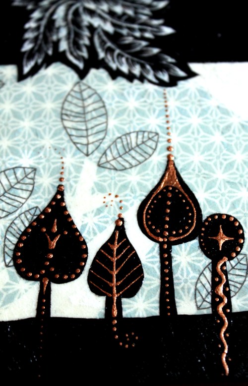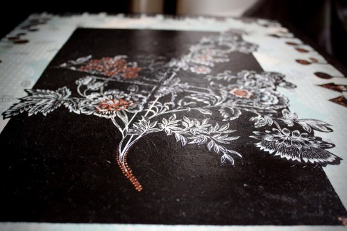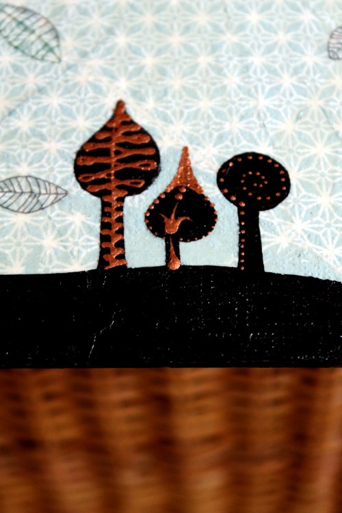 Először nem akartam ezt a megoldást feltenni a blogra, hiszen dekupázsolni mindenki tud… gondoltam… aztán amikor elkezdtem jöttem rá, hogy nagy, sima felületet egyenletesen lefedni még a jól bevált, és a hibák elfedésére kiváló szalvétatechnikával sem egyszerű… vissza is kellett szednem az egyik darabot, aminek csiszolás, újraragasztás lett az eredménye. Viszont magamat ismerve már az elején tudtam, hogy nem fogok megállni a dekupázsnál… jött hát a festegetés, kísérletezgetés, újabb szalvéta-réteg, majd a kedvencem, a kontúrpaszta.