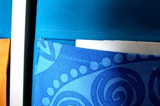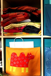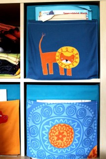 A zikeában rengeteg dobozt, kosarat, fiókot lehet kapni, ezt tudjuk… ezeket személyre is lehet szabni… én mégsem találtam olyat, a mi árban, funkcióban, megjelenésben is maradéktalanul megfelelt volna… akkoriban elég szűkös volt a költségvetésünk, így mindent kreativitással kellett megoldani. Vettem hát egy nem igazán szép, de tartósnak tűnő, kék textilfiókot, ennek elejére varrtam zsebeket, a szintén az áruházban kapható, nagyon kedves gyerekmotívumokkal díszített textilek felhasználásával. Ezek a fiókok otthon csak úgy voltak a polcon… most találták meg a helyüket, amikor megvettük a hozzá való polcot is… gombhoz a kabátot…