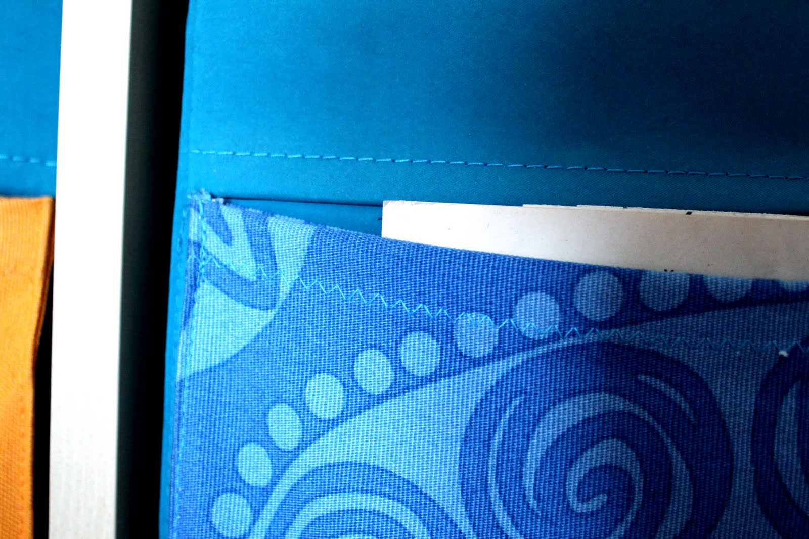 A zikeában rengeteg dobozt, kosarat, fiókot lehet kapni, ezt tudjuk… ezeket személyre is lehet szabni… én mégsem találtam olyat, a mi árban, funkcióban, megjelenésben is maradéktalanul megfelelt volna… akkoriban elég szűkös volt a költségvetésünk, így mindent kreativitással kellett megoldani. Vettem hát egy nem igazán szép, de tartósnak tűnő, kék textilfiókot, ennek elejére varrtam zsebeket, a szintén az áruházban kapható, nagyon kedves gyerekmotívumokkal díszített textilek felhasználásával. Ezek a fiókok otthon csak úgy voltak a polcon… most találták meg a helyüket, amikor megvettük a hozzá való polcot is… gombhoz a kabátot…