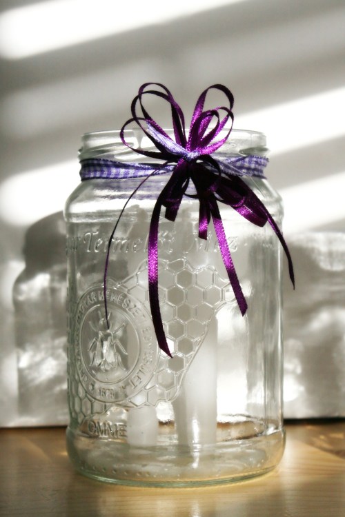 A kiürült mézes üvegekbe beleállítottam 3-3 vékony fehér gyertyát, amiket évek óta a fiókban őrzök. A nykukra masnit kötöttem, és kész is az ünnepi gyertyatartó. Egyszerű, igaz?