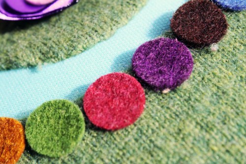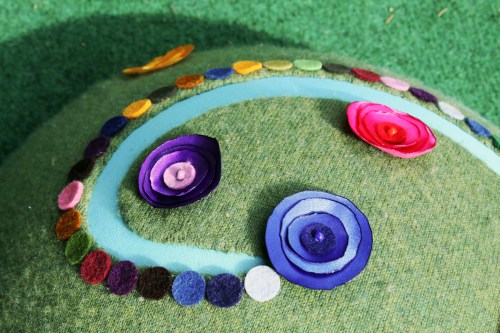 Néhány szatén virág, gyöngy, és filckorongok (Foltbolt), és kész is a virágos domboldal, amiről színes kavicsokkal szegélyezett patak csordogál… ideális hely pónik számára 🙂