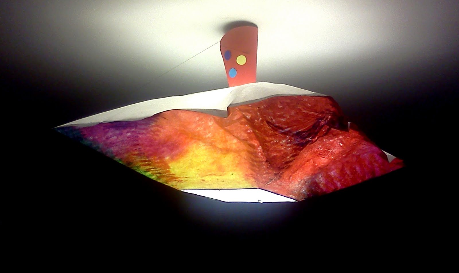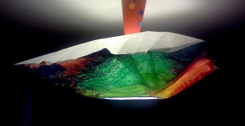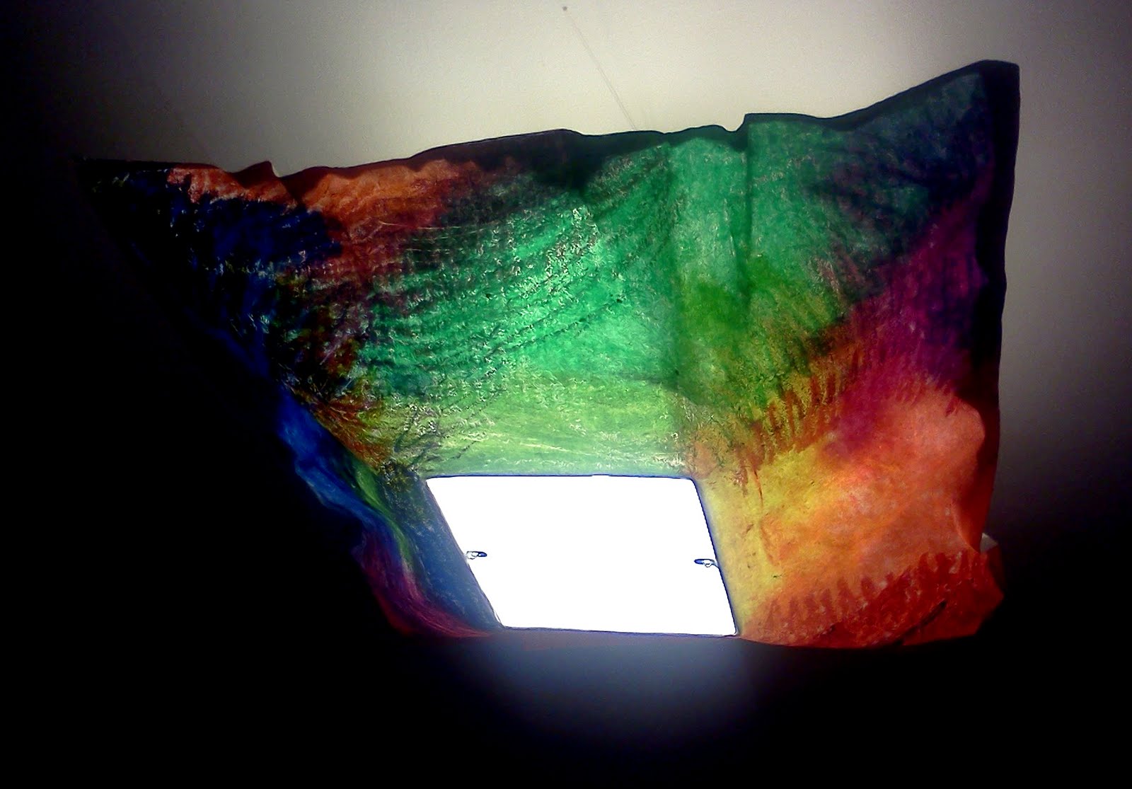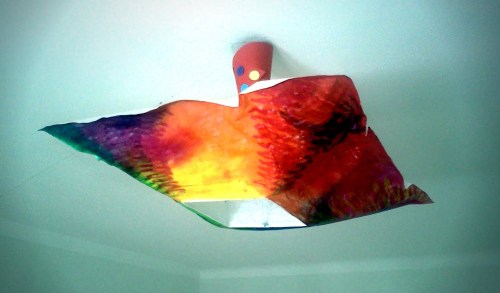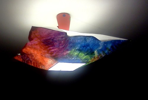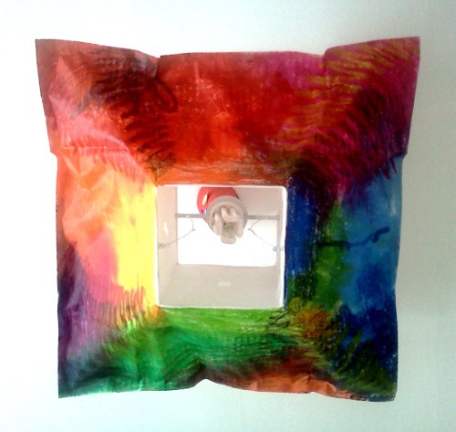 Amikor beköltöztünk az albérletbe, a lakás első feltűnő adottsága (vagy hiányossága) az alacsony belmagasság volt. A villanykörték szabadon lógtak a plafonról, mivel egy hagyományos mennyezeti lámpa fejbeverő élményt okozott volna (a plafonra simuló lámpák nem adnak elég fényt, és nem is szeretjük őket)… múltkor, amikor az ikeában jártam, felfedeztem egy új típusú rizspapír lámpaburát, ami egyébként inkább párnahuzatra emlékeztet, de elég jópofának, és főleg olcsónak tűnt. Vettem belőle minden szobába egyet… a gyerekszobait ki is színeztük, ami azon kívül, hogy rendkívül dekoratív, nagyon jó mókának is bizonyult! Kingus magára is kent a festékből, elég bőségesen… “hogy szép legyen a testem” mondta 🙂